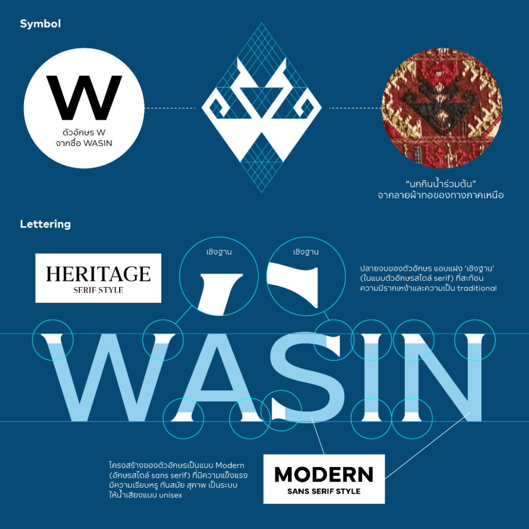 โลโก้ WASIN ประกอบด้วยองค์ประกอบหลัก 2 ส่วน คือ ส่วน symbol (สัญลักษณ์) และส่วน lettering (ตัวอักษร) สำหรับ symbol ถูกออกแบบเป็นรูป "นกกินน้ำร่วมต้น"ในสไตล์เรขาคณิต ซึ่งได้รับแรงบันดาลใจจากลายผ้าชื่นของกลุ่มชาติพันธุ์ไทในภาคเหนือ ผสานกับรูปทรงของ ตัวอักษร "W" จากชื่อแบรนด์ WASIN