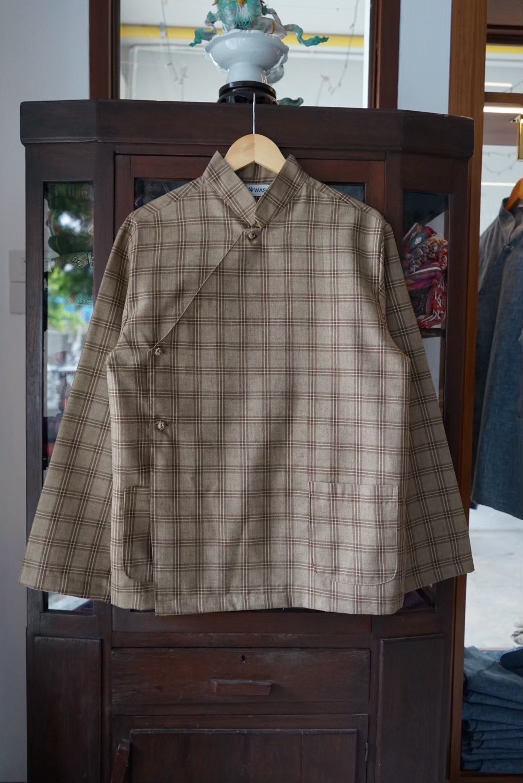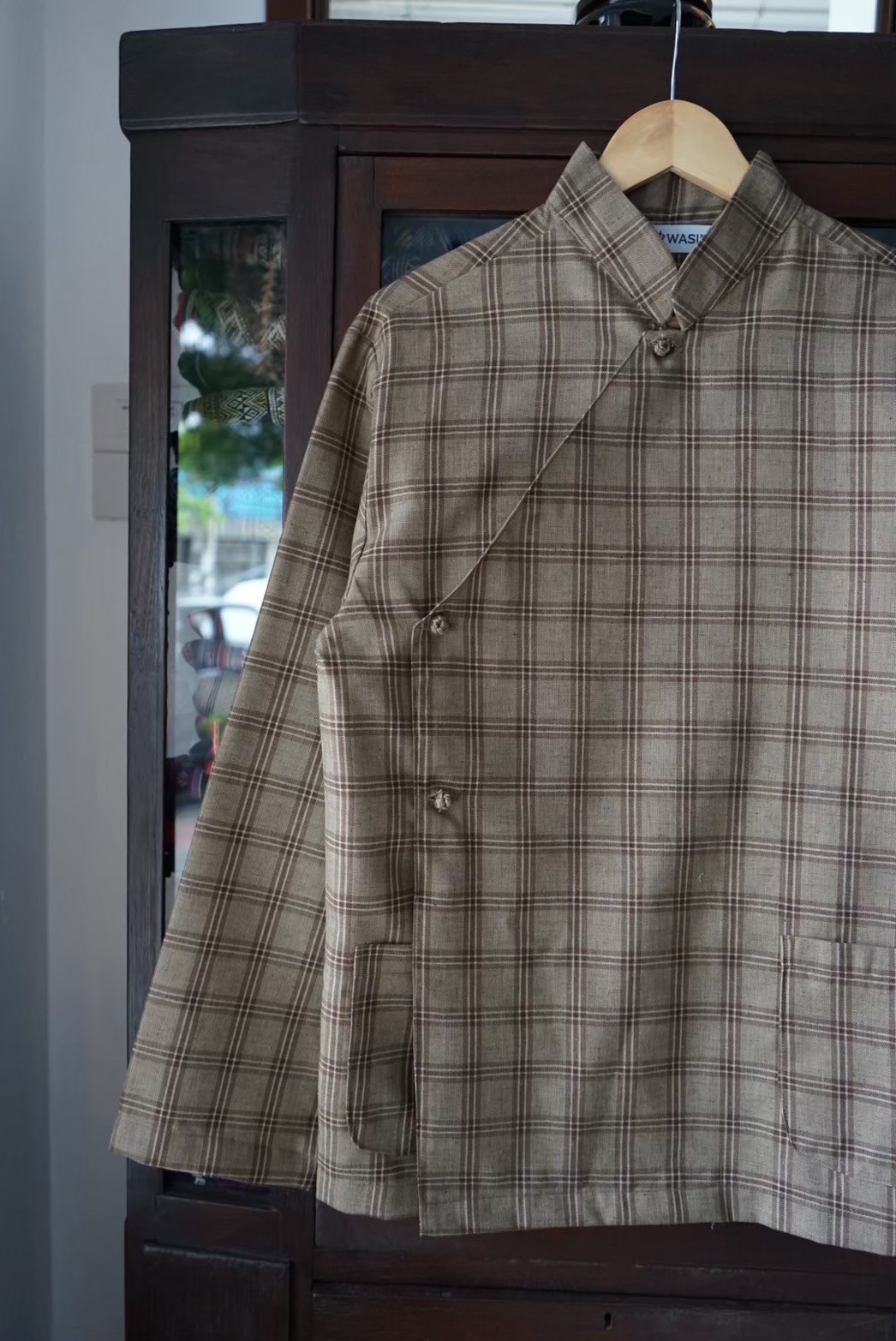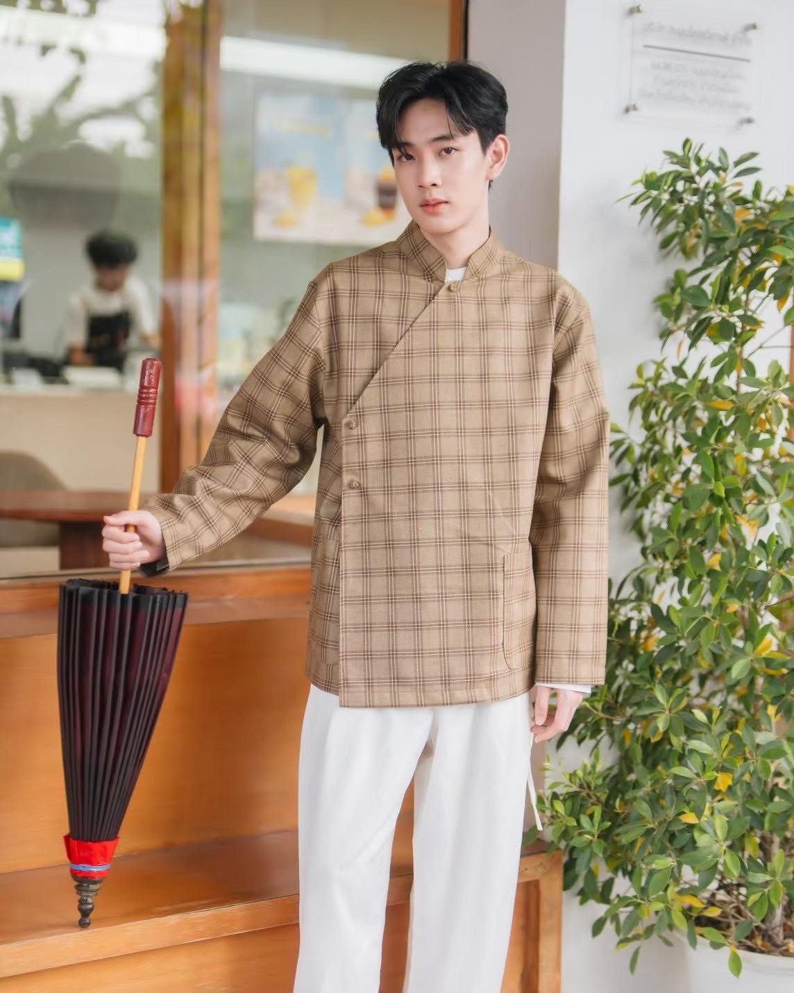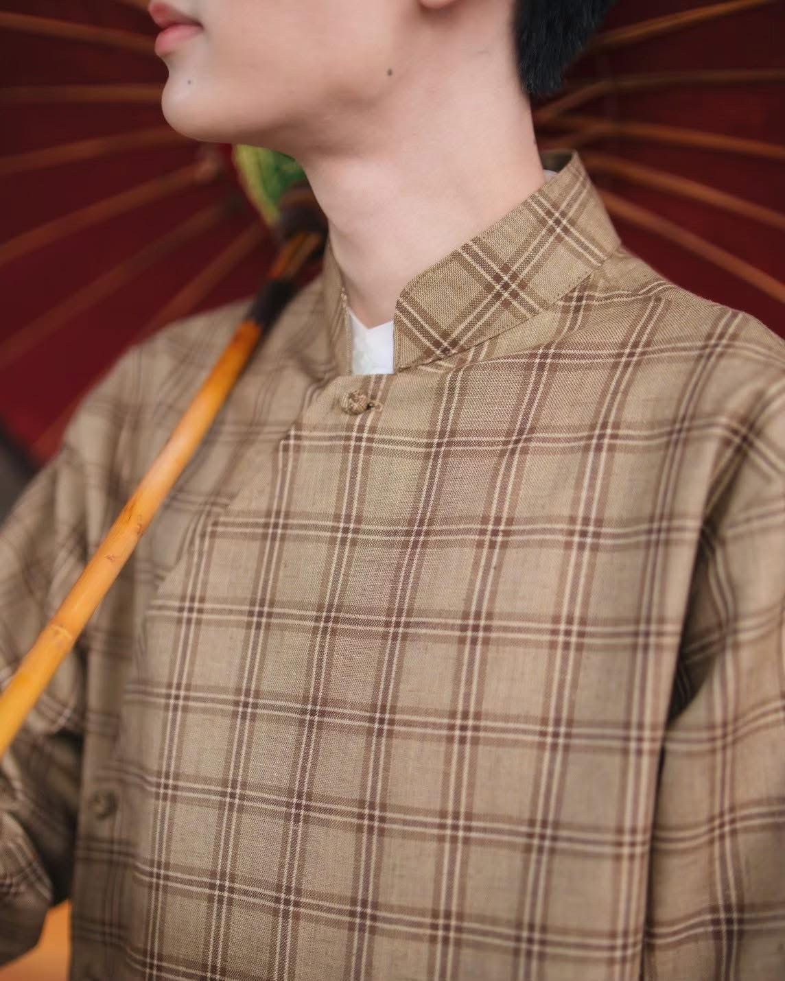 Elevate your wardrobe with our Heritage Plaid Mandarin Collar Shirt—a sophisticated blend of traditional Thai aesthetic and contemporary design. Crafted in a warm beige tone with understated plaid detailing, this versatile long-sleeved shirt features a classic mandarin collar and button-front closure, offering timeless elegance with modern appeal.
